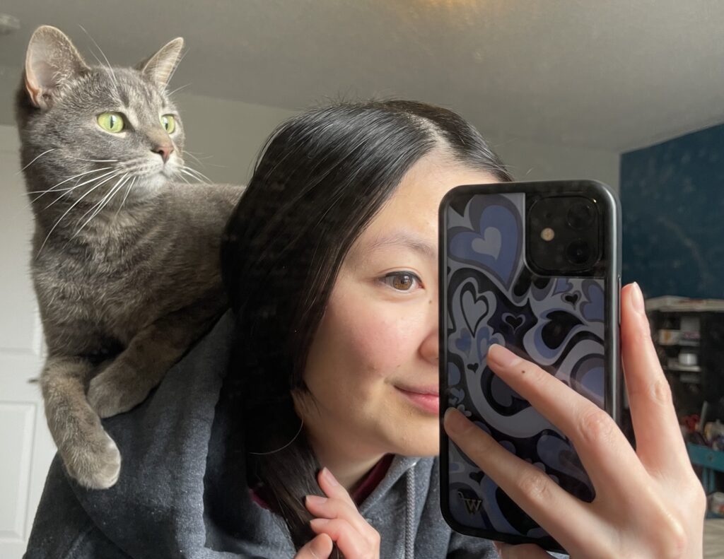 Smokey is sitting on my back and posing for a mirror selfie in my room. (Photo credit: Isabella Disley)