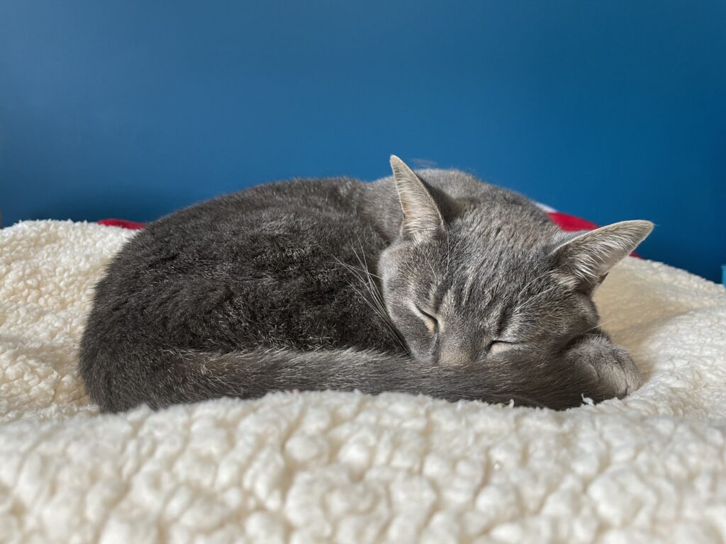 Smokey is curled up in a ball, taking a nap on a cream-coloured sherpa blanket on my bed in my room. (Photo credit: Isabella Disley)
