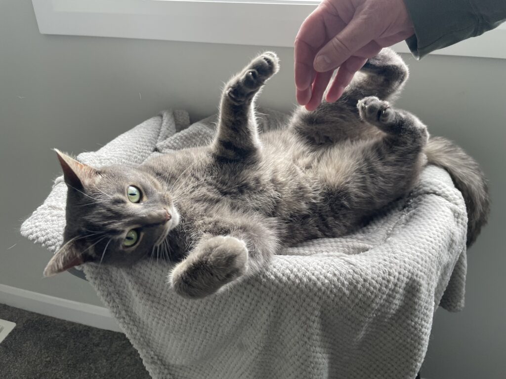 Smokey lies belly-up on a light grey blanket on her new Costco-bought dark grey cat tree. (Photo credit: Isabella Disley)