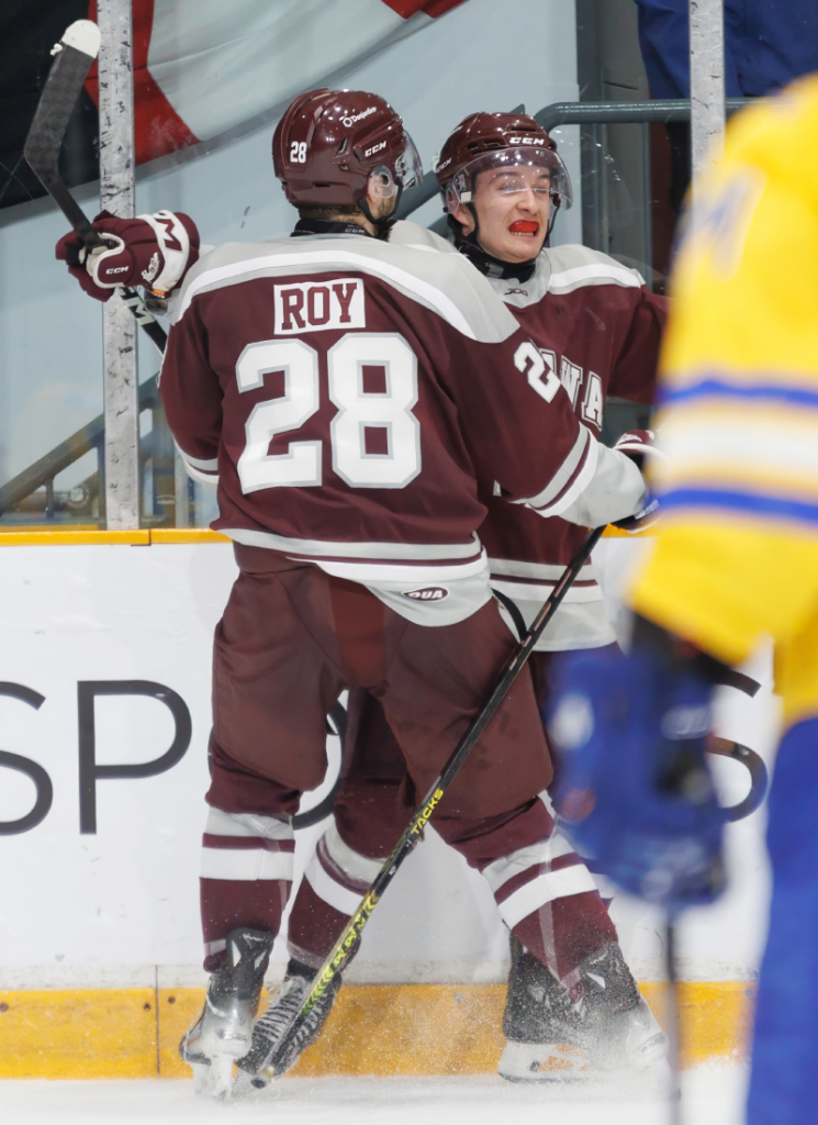 Vincent Labelle celebrates his second-period goal with Charles-Antoine Roy. Photo: Derek Mellon