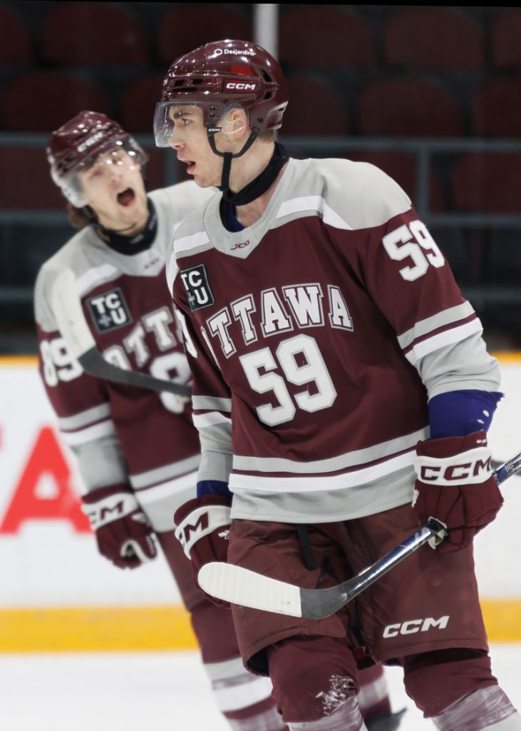 “In playoff, tight games, you need big guys like (Martin),” Gee-Gees head coach Patrick Grandmaître said of the 6’4″, 205-lb. player from Sudbury. (Guys) that can play physically, push off people and be a menace around the net.”