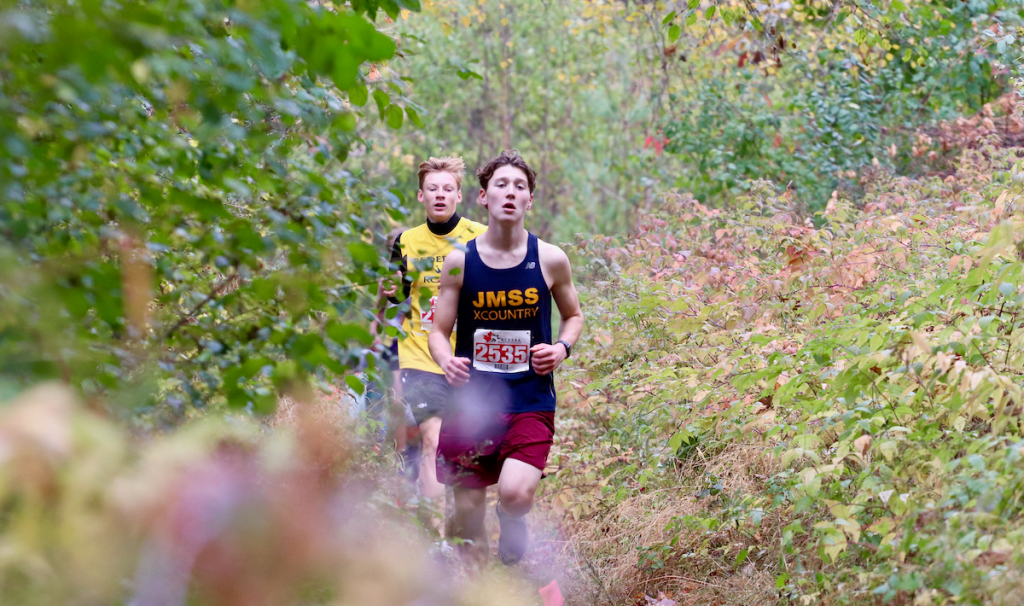 Novice-age runner Joshua Roseman (left) placed 24th in the junior boys’ 5 km race to help Immaculata win the team title at the 2025 NCSSAA cross-country running championships on Oct. 23 at the Hornets Nest. Photo: Dan Plouffe