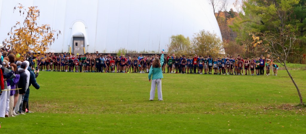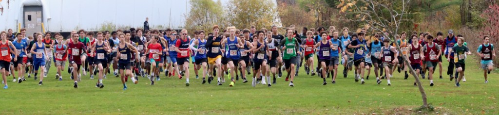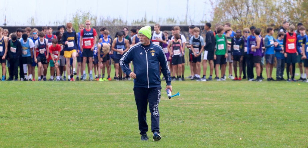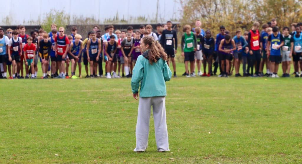 Colonel By’s Graeme Siderius (centre) gets into position at the starting line before winning the novice boys’ race at the 2025 NCSSAA cross-country running championships on Oct. 23 at the Hornets Nest. Photo: Isabella Disley