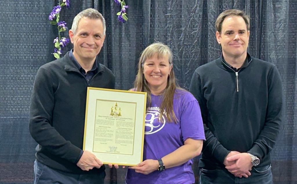 (From left) Mayor Mark Sutcliffe presented Ottawa Gymnastics Centre interim executive and 2004 Olympian Heather Ross McManus and OGC club president Martin Rajotte a letter from the City of Ottawa to mark OGC’s 65th anniversary. Photo provided